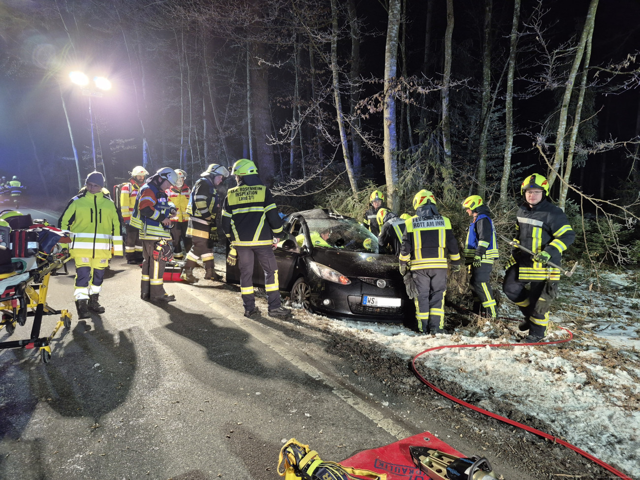 Ein PKW kam alleinbeteiligt von der Fahrbahn ab und prallte mit der Fahrerseite gegen einen Baum. Eine verletzte Person war im Fahrzeug eingeschlossen, jedoch glücklicherweise nicht eingeklemmt. Die Feuerwehr Rott am Inn schuf eine große Rettungsöffnung. Die Besatzung des Aßlinger HLF stand mit zweiten Rettungssatz in Bereitschaft.
